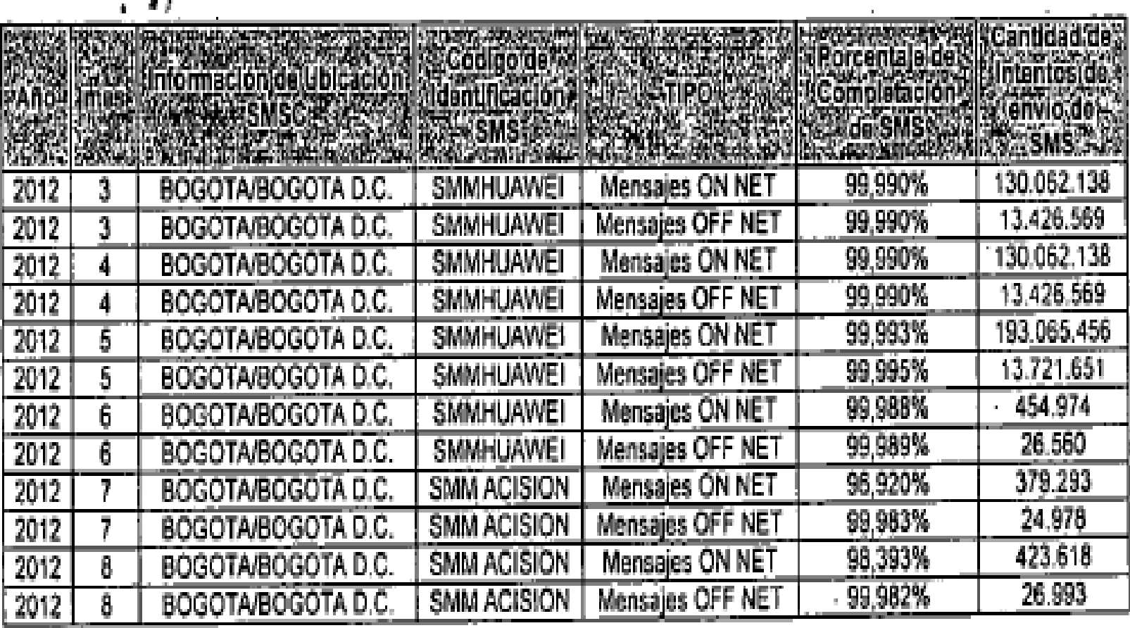 "Presunta comisión de la infracción descrita en el Numeral 11 del artículo 52 del decreto ley 1900 de 1990 por el incumplimiento del régimen de calidad previsto en la resolución CRC 3067 de 2011 respecto de la información a reportar para el indicador porcentaje de complementación de mensajes cortos de texto para el periodo de Marzo a Agosto de 2012."