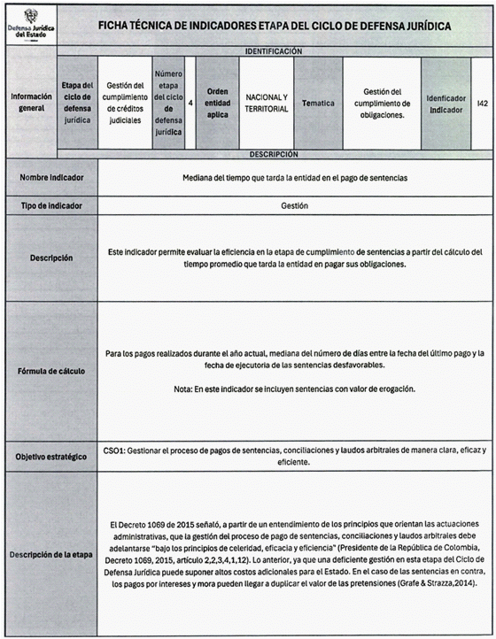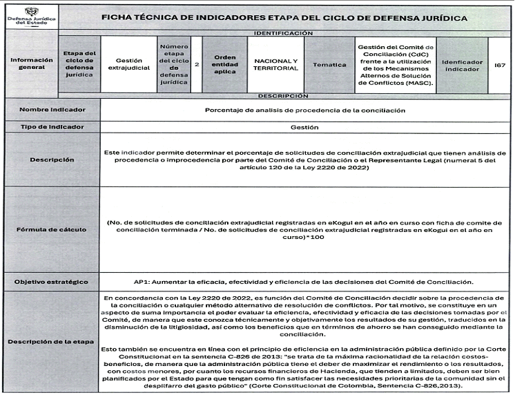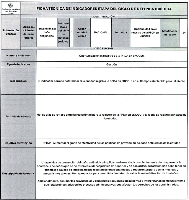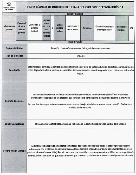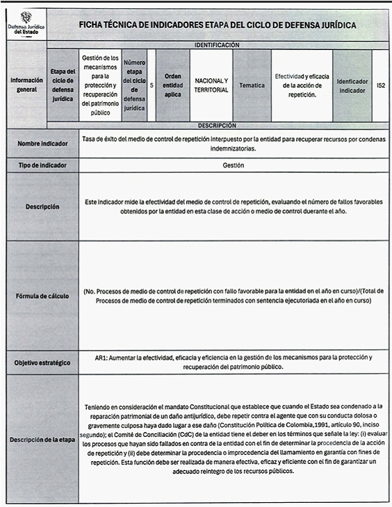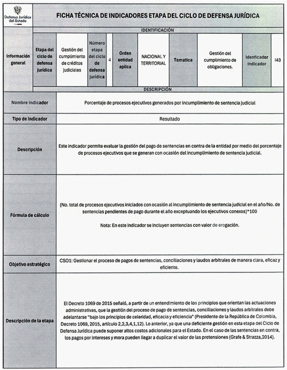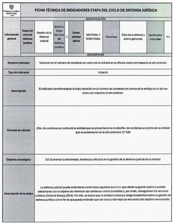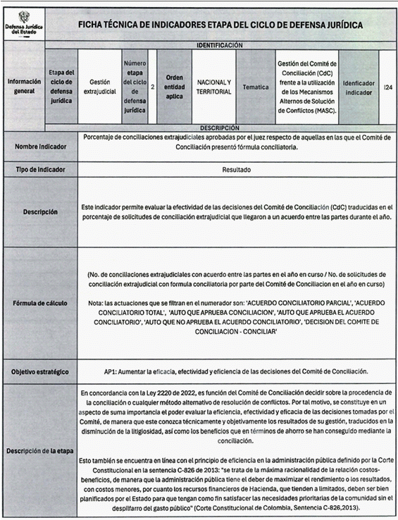 6. Los veinticuatro (24) indicadores de esta medición se distribuyen también en las distintas etapas del Ciclo de Defensa Jurídica del Estado, así: (i) tres (03) indicadores en la etapa de gestión del conocimiento, (ii) cuatro (04) en prevención del daño antijurídico, (iii) cuatro (04) en gestión extrajudicial, (iv) siete (07) en gestión de la defensa judicial, (v) cuatro (04) en gestión del cumplimiento de créditos judiciales y (vi) dos (02) en gestión de los mecanismos para la protección y recuperación del patrimonio público.