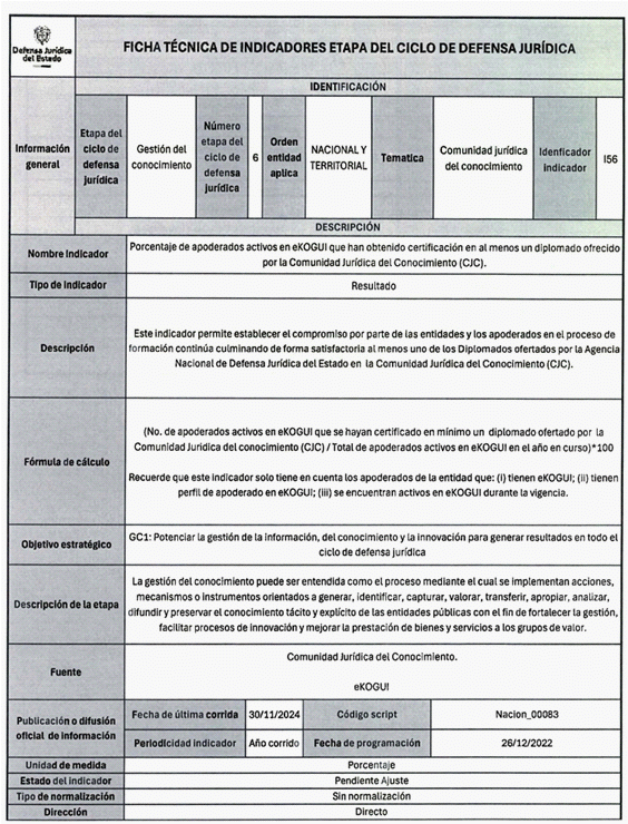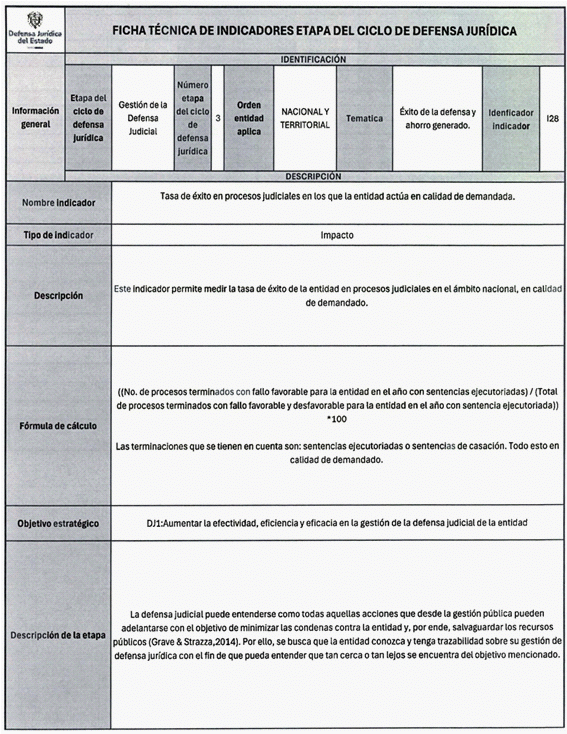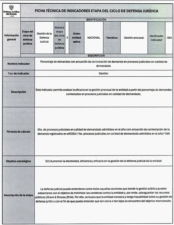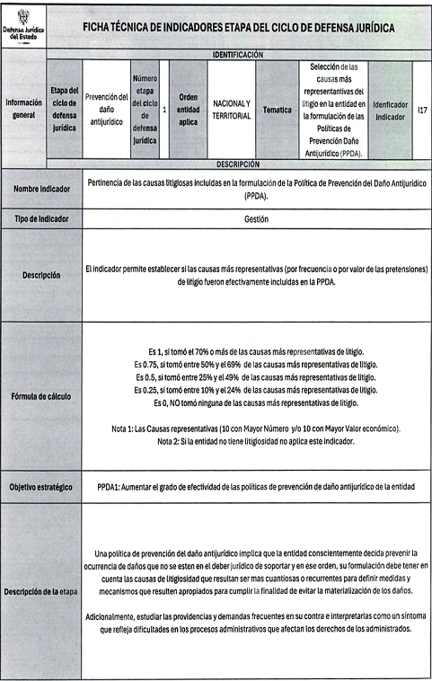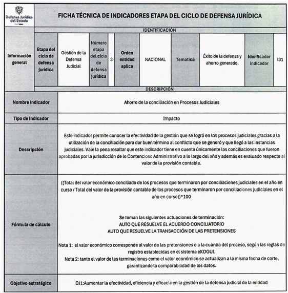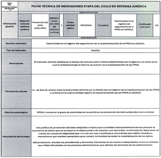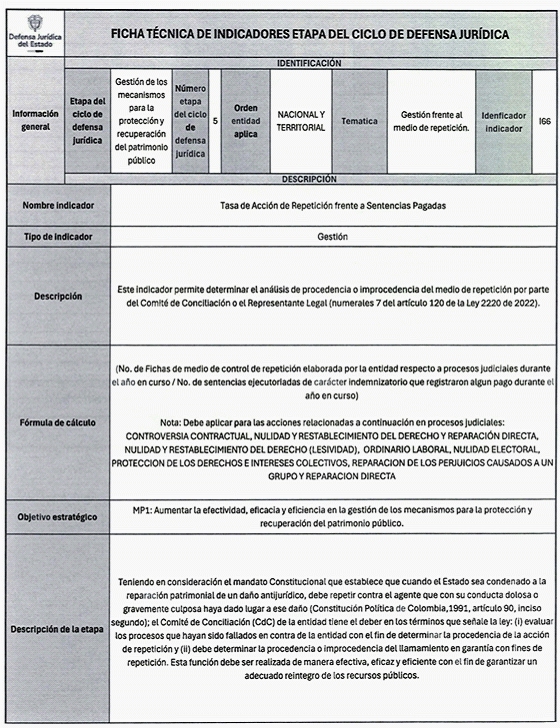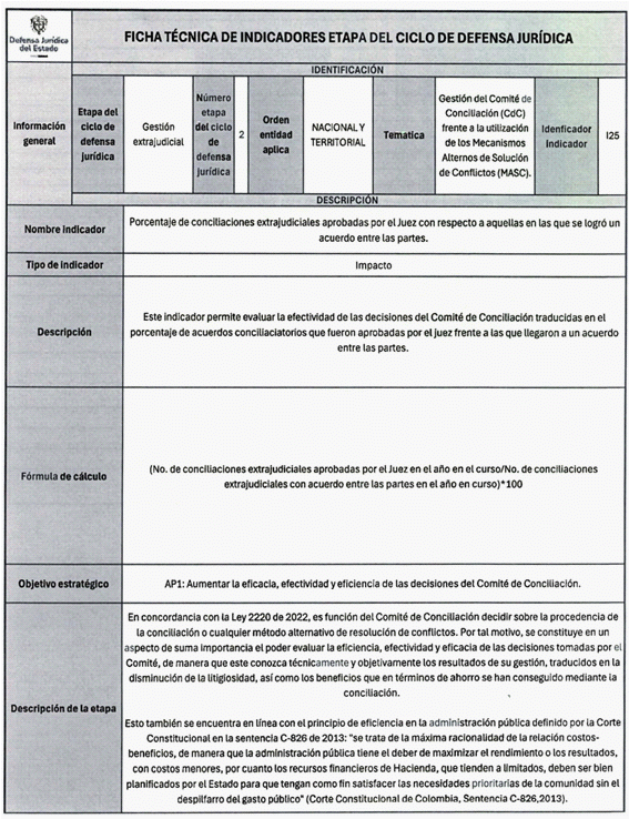 6. Los veinticuatro (24) indicadores de esta medición se distribuyen también en las distintas etapas del Ciclo de Defensa Jurídica del Estado, así: (i) tres (03) indicadores en la etapa de gestión del conocimiento, (ii) cuatro (04) en prevención del daño antijurídico, (iii) cuatro (04) en gestión extrajudicial, (iv) siete (07) en gestión de la defensa judicial, (v) cuatro (04) en gestión del cumplimiento de créditos judiciales y (vi) dos (02) en gestión de los mecanismos para la protección y recuperación del patrimonio público.