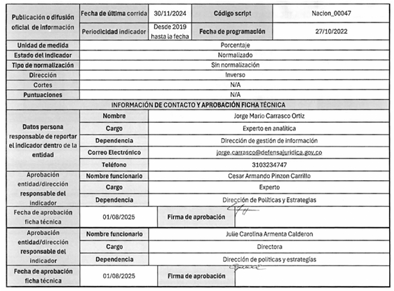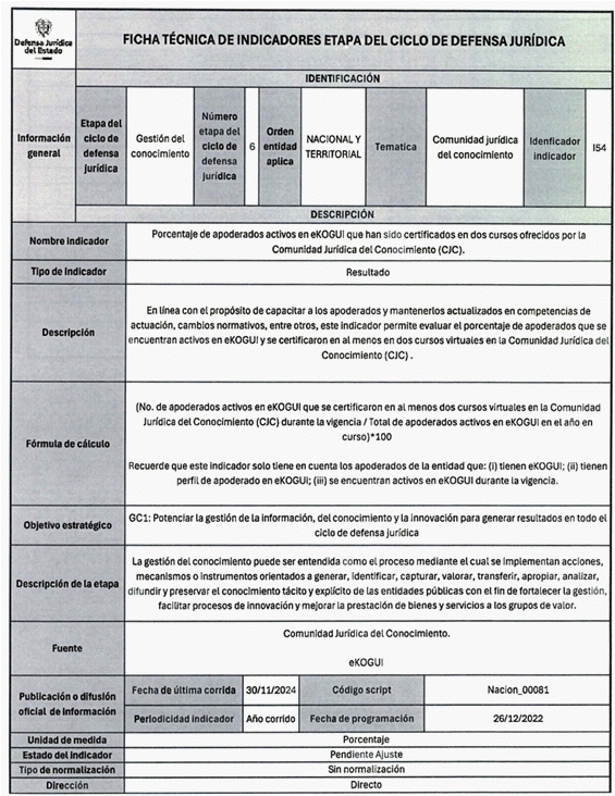 4. Tercera fase de implementación: A partir de los resultados de las primeras fases, en el 2024 se redefinieron los indicadores del MGR Nacional y su fuente de captura, se expidieron las Circulares No. 11 del 20 de mayo de 2024 y No. 31 del 19 de diciembre de 2024 en las que se exhortó a las entidades a actualizar su información litigiosa y se hizo referencia a la implementación del Modelo de Gestión por Resultados en entidades públicas del orden nacional.