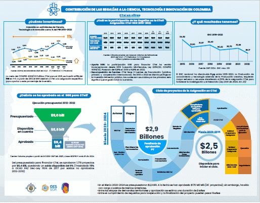 Respecto a la fuente de financiación de CTel, la Ley 2279 del 2022 decretó el presupuesto SGR del bienio 2023-2024, asignando a este rubro alrededor de $3 billones de pesos m/cte. Posteriormente, la Ley 2441 del 2024 dispuso lo correspondiente para el bienio 2025-2026 presupuestando para CTel más de $2.55 billones de pesos m/cte.
