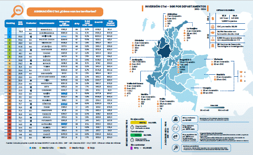 En contraste se encuentra Antioquia, que con un IDIC de 63 puntos lidera la inversión SGR en CTel ($564,1 mil millones) y destina el 59% de estos recursos a investigación y desarrollo, indicando fortalezas en la gestión de recursos para el sector.