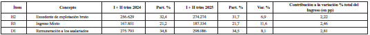 | Concepto | I + II trim 2024 | Part.% | I + II trim 2025 | Part.% | Var.% | Contribución a la variación % total del Ingreso (en pp) |
