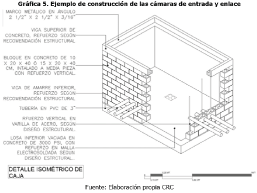 Cámara de entrada: Elemento de la infraestructura soporte de la red interna de telecomunicaciones del inmueble. Compartimiento, habitáculo o recinto subterráneo de la infraestructura que soporta la red interna de telecomunicaciones del inmueble, ubicado en la zona exterior del mismo y a la que confluye la canalización externa de la infraestructura del inmueble que soporta la red de telecomunicaciones de este. La cámara de entrada permite, a través de la canalización externa del inmueble, el acceso de los cables de las redes de alimentación de los diferentes proveedores de servicios al salón de equipos de telecomunicaciones para establecer su conexión con la red interna de telecomunicaciones del inmueble. Su diseño y construcción es responsabilidad del constructor del inmueble.