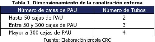 Canalización externa: Parte de la infraestructura soporte de la red interna de telecomunicaciones del inmueble, conformada por un conjunto de ductos instalados en la zona exterior del inmueble entre la cámara de entrada hasta el punto de entrada general del inmueble. Está encargada de introducir en el inmueble las redes de alimentación de los proveedores de servicios. Su construcción es responsabilidad del constructor del inmueble.